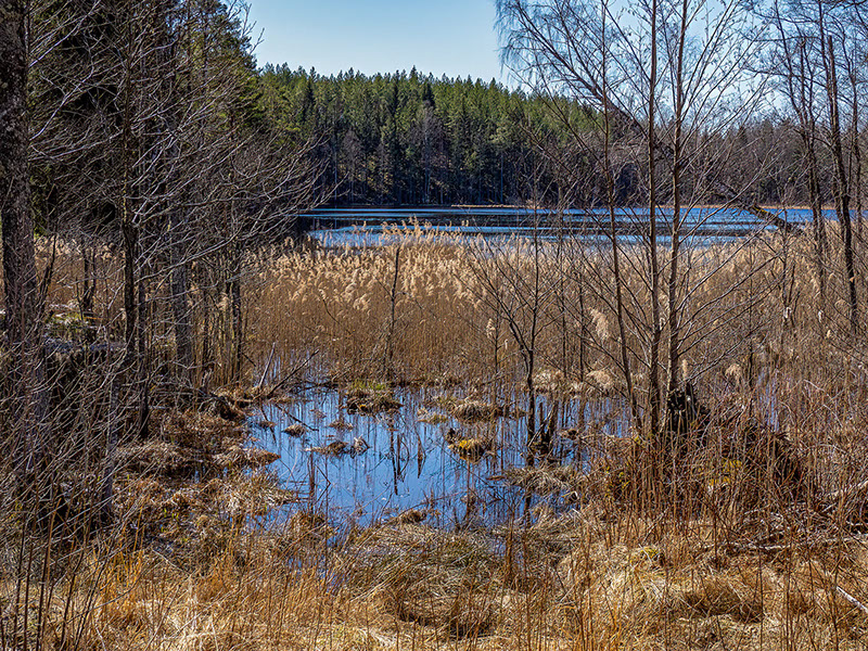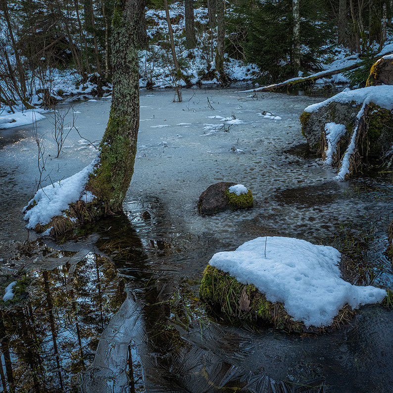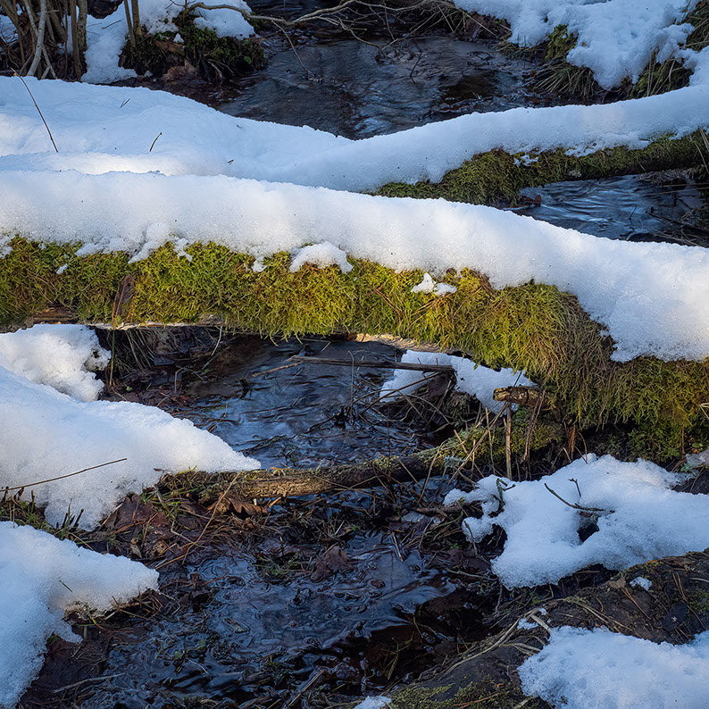 På en del ställen har smältvattnet blivit till sjungande små bäckar som bara väntar att få ackompanjera taltrasten och dubbeltrastens vårkonserter. Men än dröjer det några veckor så man får ännu så länge nöja sig med bäckarnas kvillrande och solens värmande ljus.