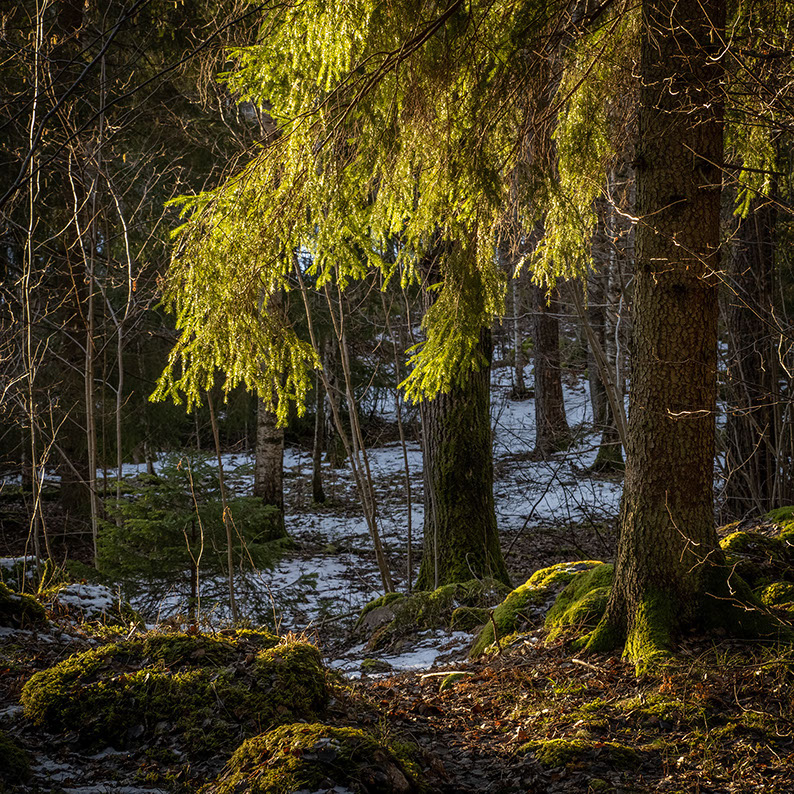 I skogen ligger ännu snön tjock i norrsidorna, annars förvandlar solen och dagsmejan långsamt men bestämt den kvarvarande snön till små rännilar som letar sig fram bland stenar och grenar.